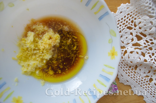 Змішуємо в тарілці натертий імбир, соєвий соус, олію, лимонну цедру та лимонний сік.