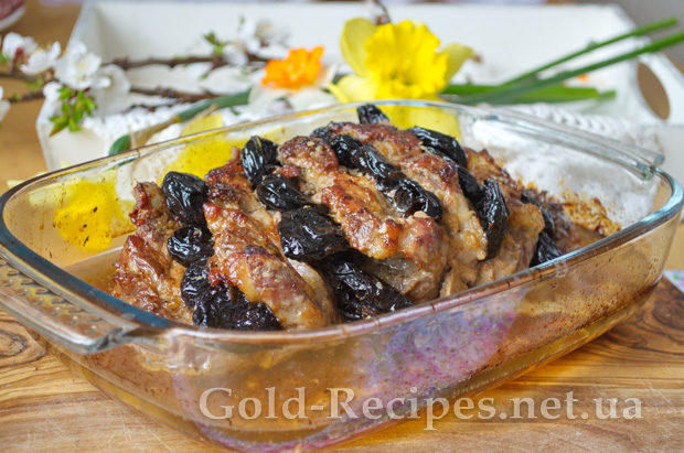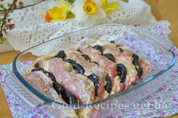 Замариновану свинину поміщаємо у форму для запікання, і заповнюємо складки чорносливом, як показано у мене на фото.