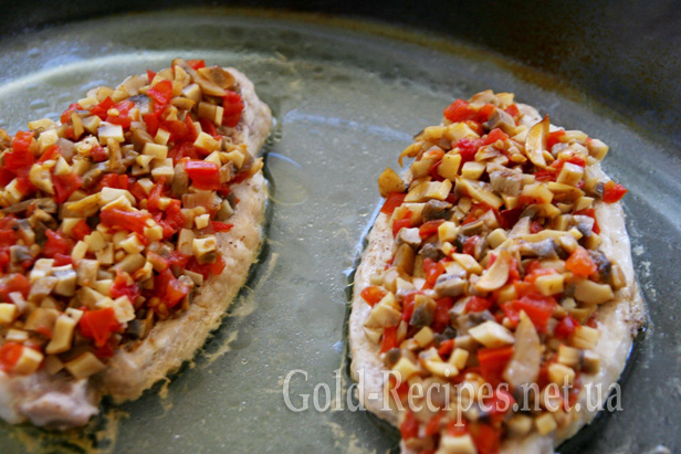 Зверху акуратно, за допомогою ложки, розміщуємо суміш грибів і помідорів. Намагайтеся трохи відступати при цьому від країв, щоб начинка не впала і виглядала апетитніше.