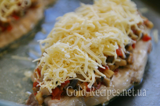 Тертий сир акуратно розміщуємо зверху на гриби та помідори.