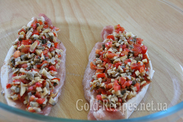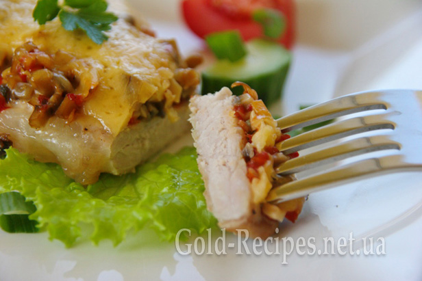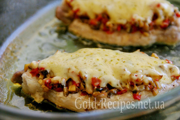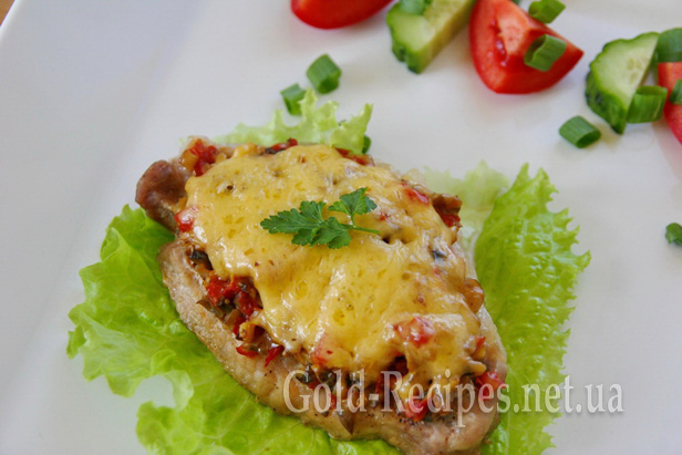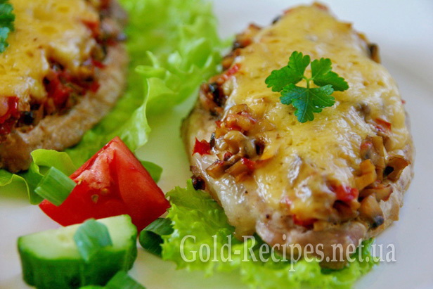 Гриби й помідори чудово доповнюють запечене м’ясо, а розплавлений сир робить його дуже апетитним.
