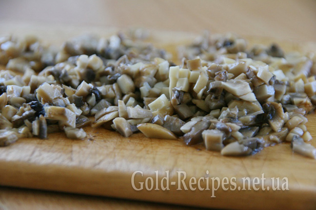 Остуджуємо гриби і нарізаємо дуже дрібними кубиками.