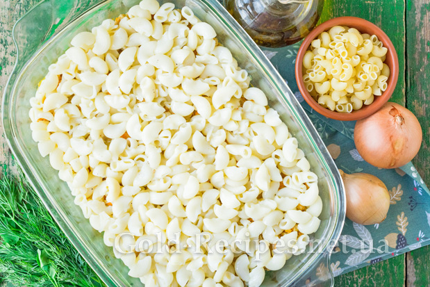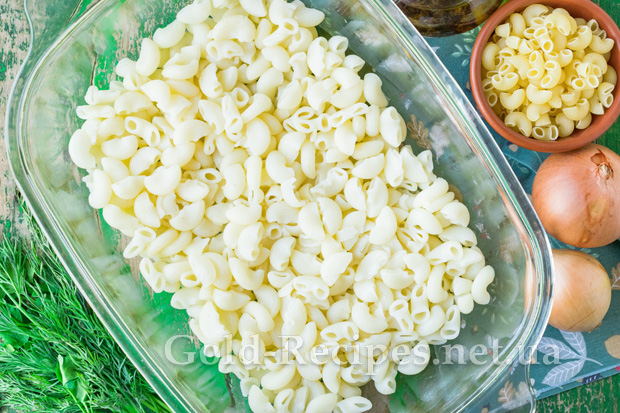 Викладемо в підготовлену форму половину відварених макаронів.