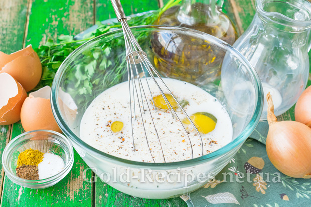 В окремому посуді з’єднаємо 3 курячих яйця, молоко, сіль і мелені спеції.
