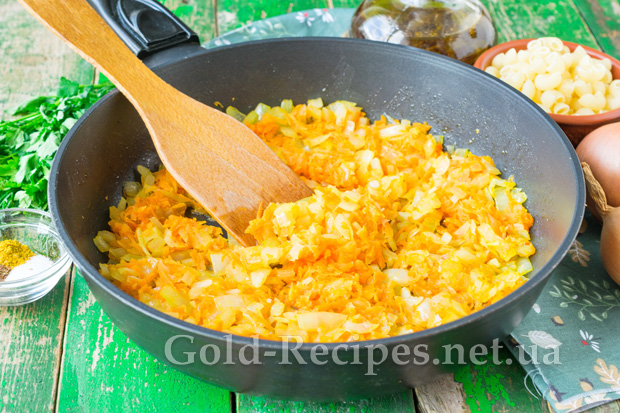 Помішуючи, будемо пасерувати моркву з цибулею на повільному вогні близько 5 хвилин.