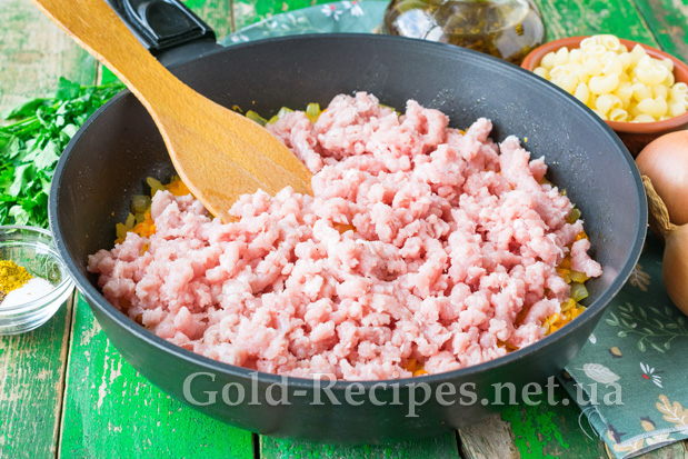 Коли цибуля та морква стануть м’якими, додамо до них свинячий фарш.