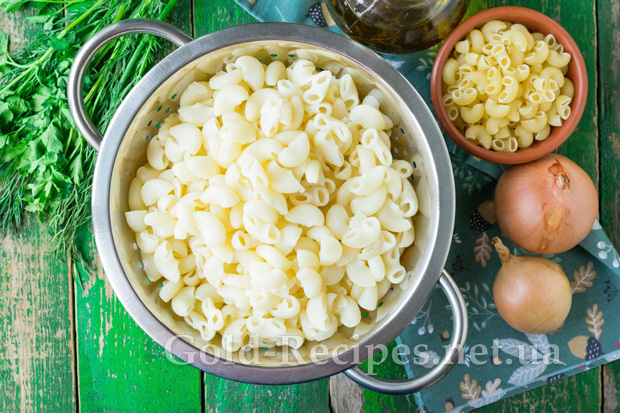 Фігурні макарони відваримо до напівготовності в підсоленій воді, відкинемо на друшляк.