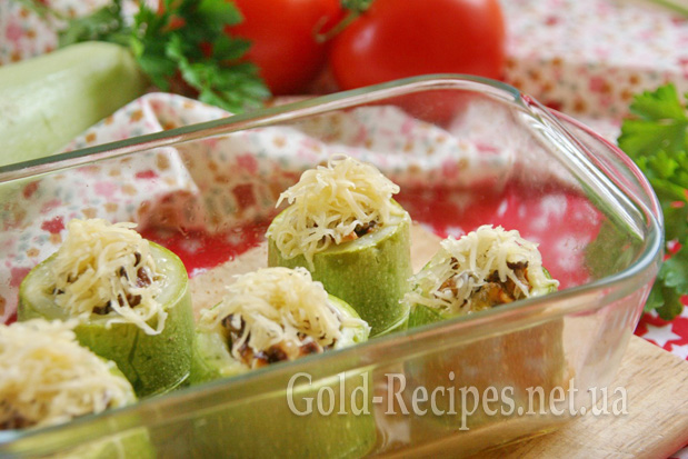 Дерев’яною скіпкою перевіряємо кабачки на м’якість – вони ще не мають бути повністю готовими, але скіпкою їх уже можна проткнути. Поверхню кабачків посипаємо сиром, що залишився, і повертаємо в духовку хвилин на 5 – 7, до розплавлення сиру.