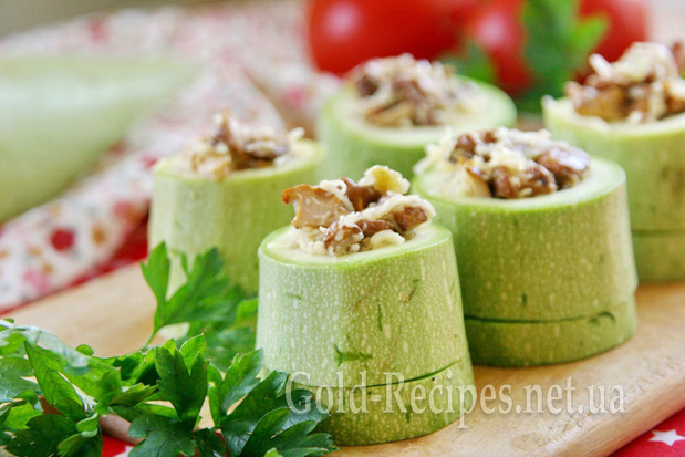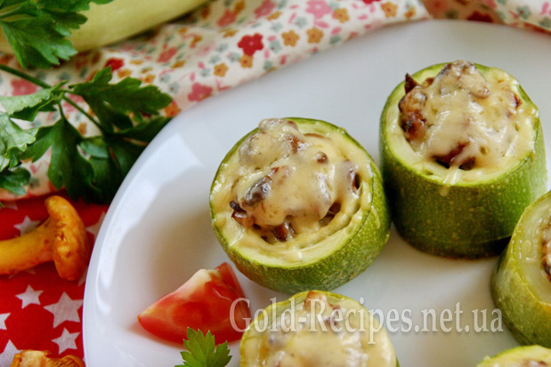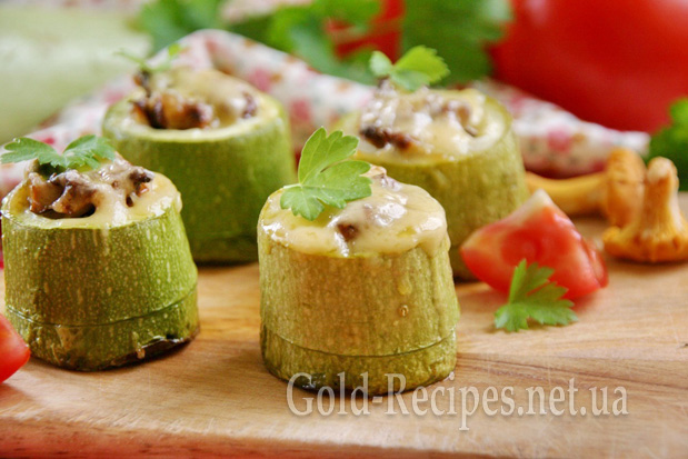Наповнюємо циліндри кабачків тушкованими лисичками, злегка їх ущільнюємо. Лисички мають трохи виступати над поверхнею кабачків.