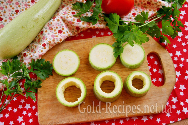 З кабачків нарізаємо шайби завтовшки до 1 см. І таку ж кількість нарізаємо циліндрів заввишки 2 – 2,5 см. Ретельно підбираємо так, щоб кожна пара – шайба і циліндр – були однакового діаметра.