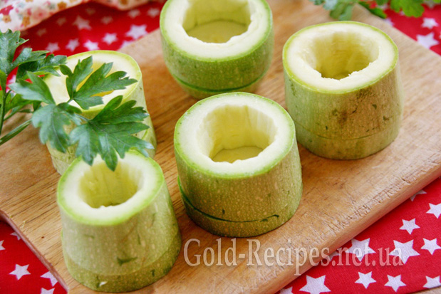 Акуратно, невеликим ножиком, із циліндрів вирізаємо м’якоть, залишаючи стінки завтовшки 5-7 мм. (Звісно, залишаються значні відходи кабачка. Їх можна використати при приготуванні іншої страви – супу, рагу тощо).