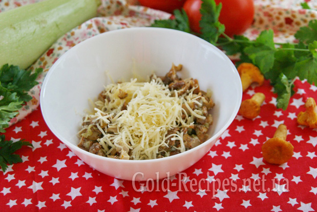Твердий сир натираємо на тертці. З’єднуємо лисички з половиною тертого сиру, перемішуємо.
