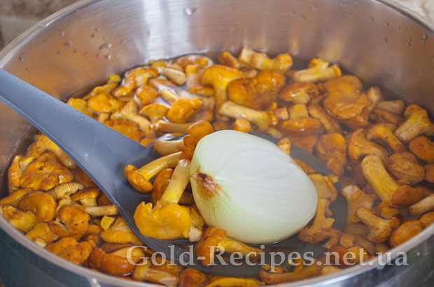 Отже, помиті лисички висипаємо в киплячу воду, і додаємо половинку цибулини.