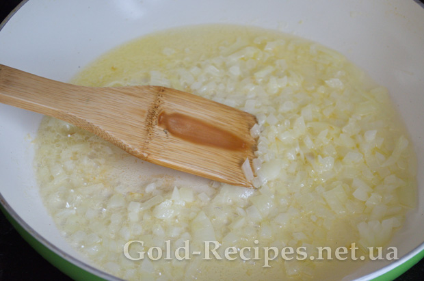 Наливаємо на сковорідку олію, додаємо вершкове масло й обсмажуємо дрібно порізану цибулю до прозорості.