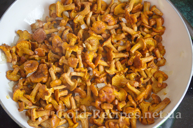 Потім додаємо до цибулі підготовлені гриби лисички.