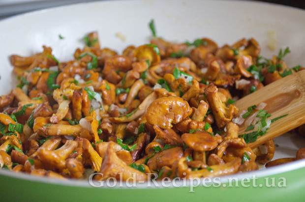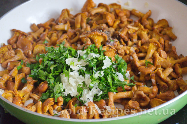 Перемішуємо, накриваємо кришкою і витримуємо 2 хвилини, щоб петрушка стала м’якою, потім знімаємо лисички з плити.