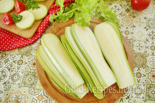 Ріжемо кабачки на пластини поздовжні пластини товщиною приблизно 0,5 см.