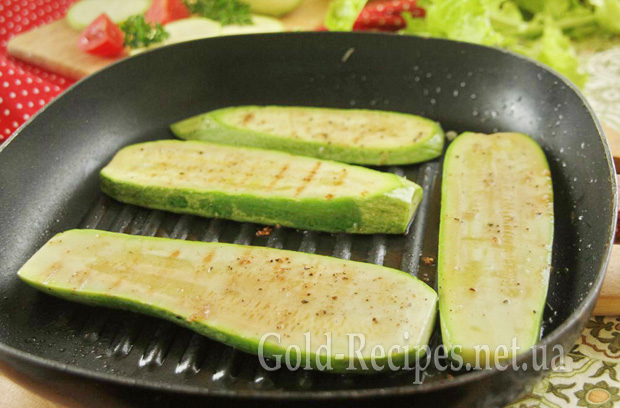 Викладаємо на неї кабачки та смажимо на середньому вогні з двох боків до утворення золотистих смужок, характерних для приготування на сковороді гриль.
