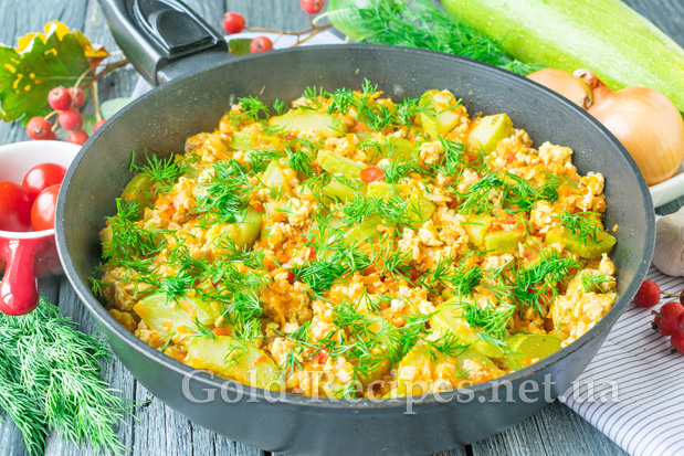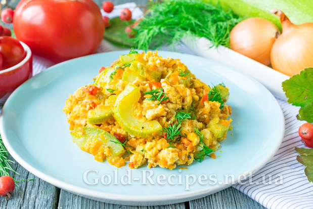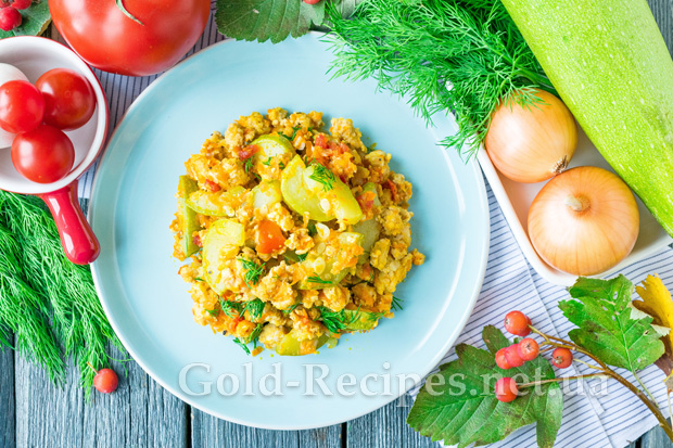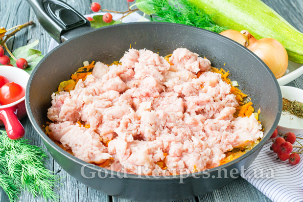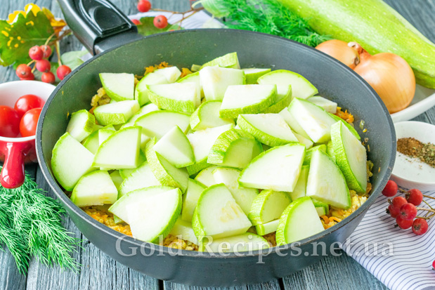 Кабачок помиємо, поріжемо чверть кільцями. Якщо овочі молоді, шкірку можна попередньо не очищати. Додамо кабачки до обсмаженого фаршу з овочами, перемішаємо. Накривши сковорідку кришкою, будемо тушкувати овочі з фаршем на повільному вогні протягом 10 хвилин.