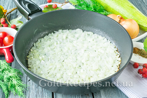 Ріпчасту цибулю очистимо від лушпиння, поріжемо дрібним кубиком. Викладемо подрібнену цибулю в глибоку сковорідку з розігрітою олією. Періодично помішуючи, будемо пасерувати овочі до легкого золотистого відтінку.
