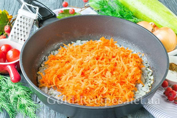 Потім додамо до цибулі терту моркву. Перемішаємо і продовжимо пасерувати овочі разом ще 3 хвилини.