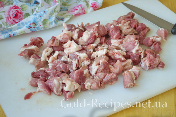 Далі займемося м’ясом. Для рецепта я використовувала м’якоть свинини з прошарком жиру, але ви можете брати будь-яке м’ясо, яке вам подобається. М’ясо нарізаємо не дуже великими шматочками, приблизно 1,5*1,5 см.