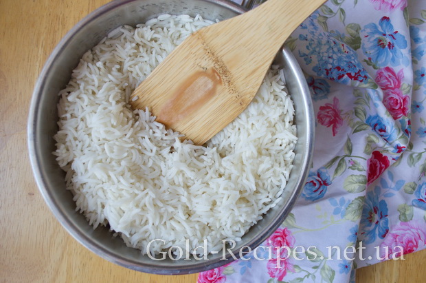 Заздалегідь відварюємо рис до готовності: змішуємо 300 гр. сухого рису і 450 мл. холодної води в каструлі, доводимо до кипіння. Чекаємо коли рис вбере всю воду, потім знімаємо з вогню.