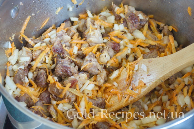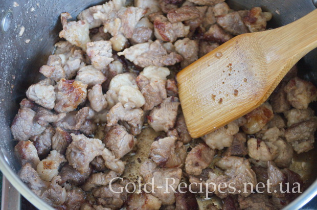 У каструлю з товстим дном, наливаємо олію, нагріваємо до максимуму і висипаємо все підготовлене м’ясо. На цьому етапі інтенсивно мішаємо свинину лопаткою, щоб воно рівномірно просмажилося і не пристало до дна каструлі.