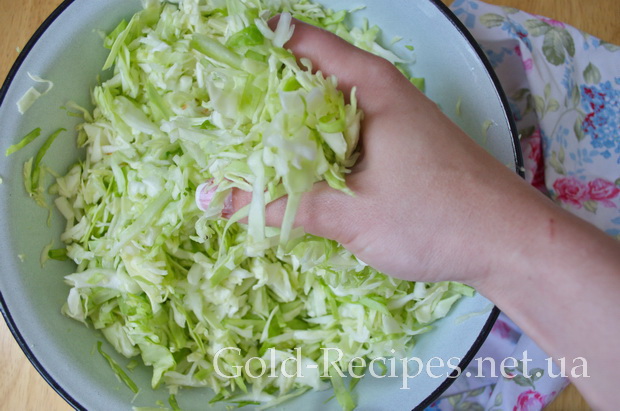 Капусту шинкуємо ножем, або за допомогою спеціальної терки. Далі слід капусту трохи присолити, і прим’яти руками.
