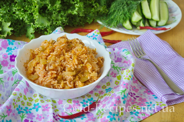 Останнім додаємо в каструлю відварений рис, знову перемішуємо, накриваємо кришкою і готуємо не більше 5 хвилин.