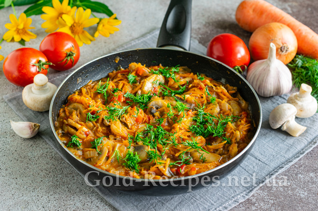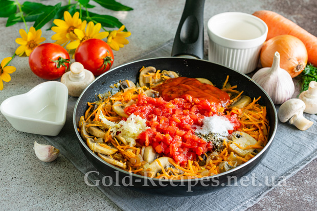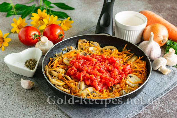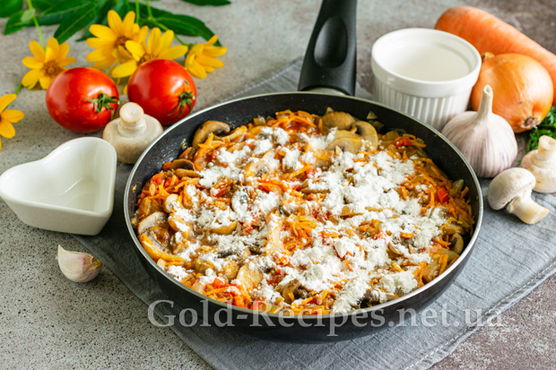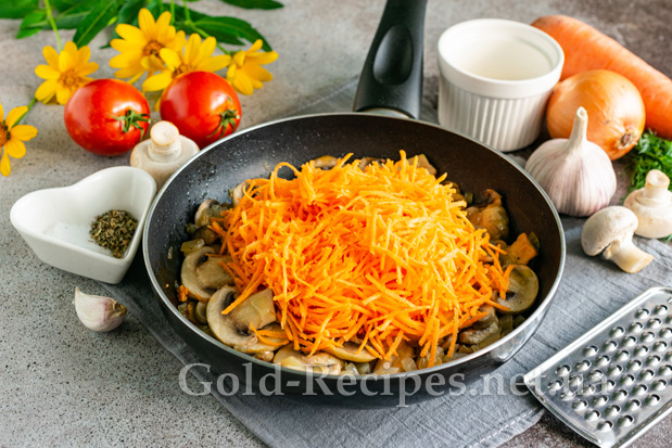 Моркву миємо, очищаємо від шкірки, подрібнюємо на тертці з дрібним полотном. Коли печериці трохи зменшаться у розмірі та випустять вологу, додаємо до них терту моркву. Перемішуємо, продовжуємо обсмажувати інгредієнти разом ще 3 хвилини.