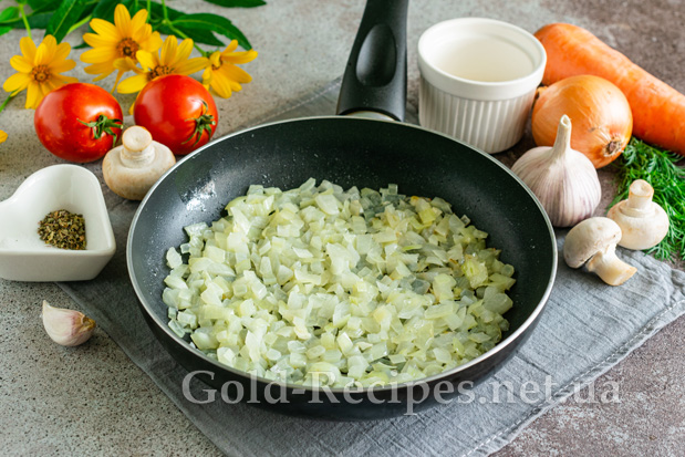 Ріпчасту цибулю чистимо від лушпиння, нарізаємо дрібним кубиком. Викладаємо овочі на сковороду з розігрітою олією. Періодично помішуючи, пасеруємо цибулю на середньому вогні до легкого золотистого відтінку.