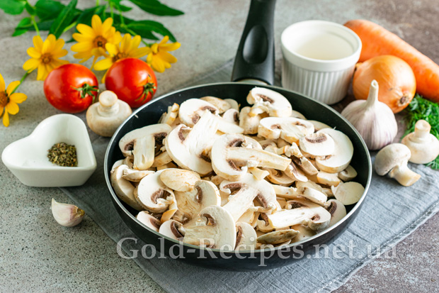 Печериці миємо, нарізаємо слайсами середньої товщини. Додаємо гриби в сковороду з цибулею. Періодично помішуючи, обсмажуємо інгредієнти разом протягом 5 хвилин.