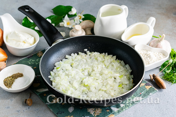 Коли цибуля на сковороді підрум’яниться, додаємо до неї порізані шампіньони.