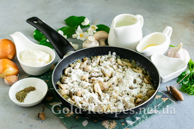 Додаємо до грибів з цибулею столову ложку пшеничного борошна, вона допоможе загустити соус. Перемішуємо інгредієнти та продовжуємо обсмажувати їх ще одну хвилину.