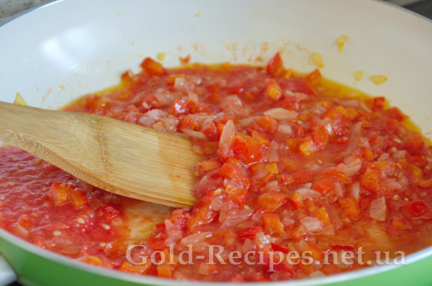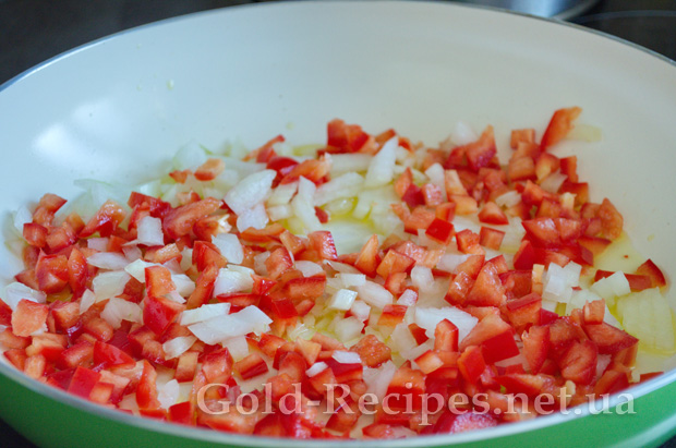 Наливаємо на сковорідку оливкову олію й обсмажуємо болгарський перець і ріпчасту цибулю, поки вони не стануть м’якими. Перець і цибулю попередньо нарізаємо кубиками.