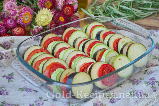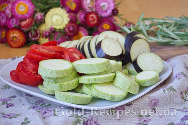 Баклажан, кабачок і помідори нарізаємо кільцями. Не надто тонко, щоб під час запікання в духовці, рататуй не перетворився на кашу.