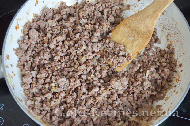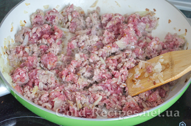 Додаємо до цибулі м’ясний фарш, і інтенсивно мішаємо лопаткою, щоб фарш просмажився рівномірно, без грудочок.