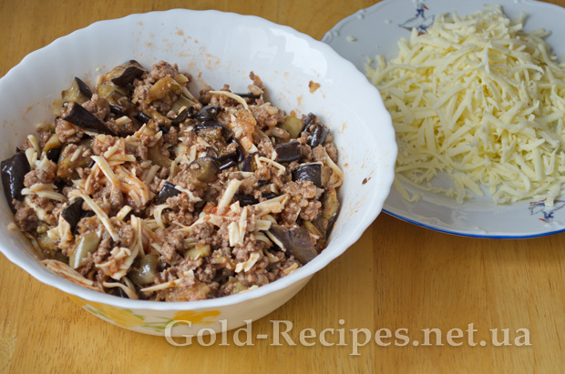 З’єднуємо в просторому посуді: баклажани, м’ясний фарш, половину сиру і розведену томатну пасту.