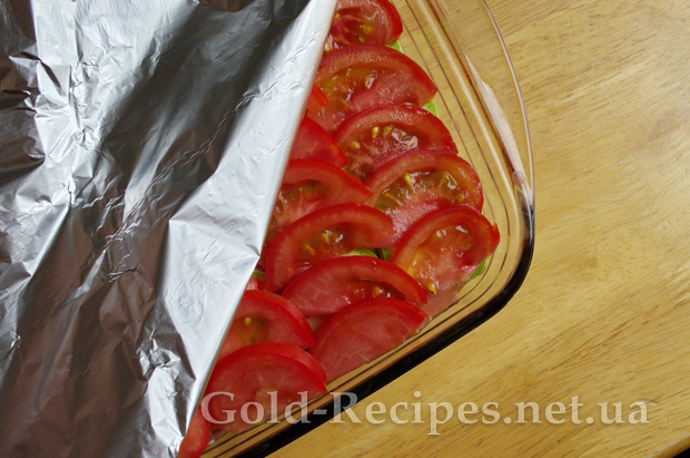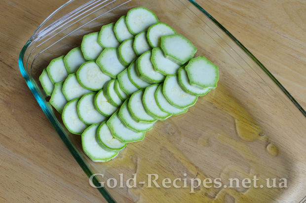 Форму для запікання змащуємо олією, і викладаємо половину кабачків в один шар по всьому дну форми, як у мене на фото.