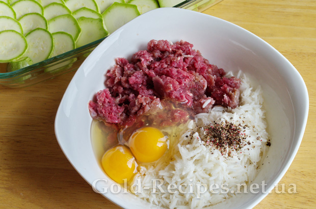У глибокій мисці з’єднуємо фарш, рис, яйця, сіль і перець.