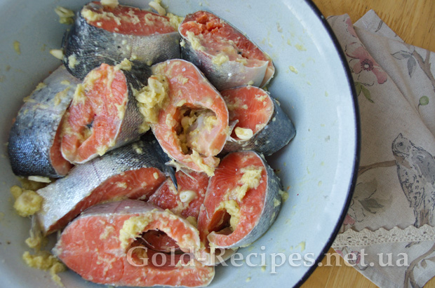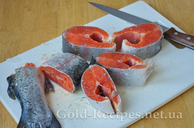 Для рецепта я використовувала охолоджену форель (з сімейства лососевих), яку розрізала на порційні шматочки.