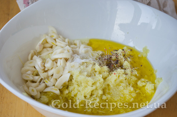 З’єднуємо в глибокій мисочці: натертий імбир, часник, видавлюємо лимонний сік, оливкову олію, сіль і перець.