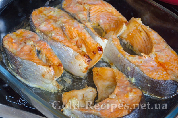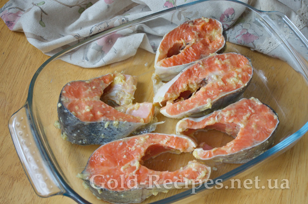 Викладаємо стейки з лосося у форму для запікання і відправляємо в розігріту до 180-200 градусів духовку на 15-20 хвилин.