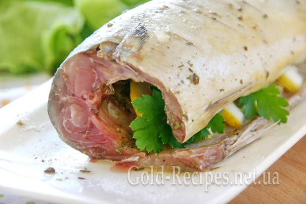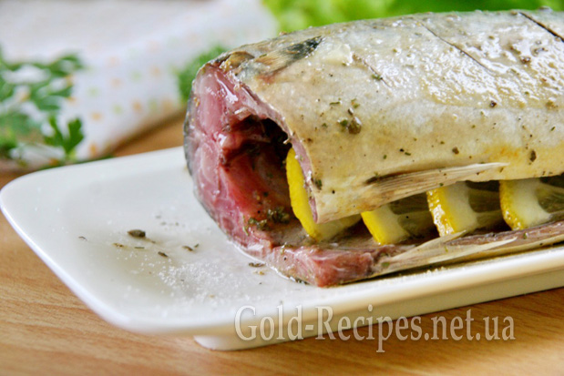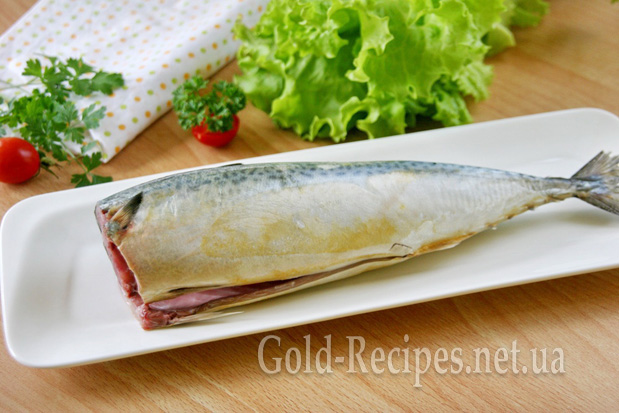 Потім робимо на одній і другій спинці скумбрії неглибокі надрізи – на відстані 1-2 см один від одного. Це потрібно для того, щоб спеції краще проникли в рибу. Наносимо сіль і спеції для риби на поверхню скумбрії. Не забуваємо і про внутрішню частину.