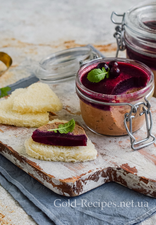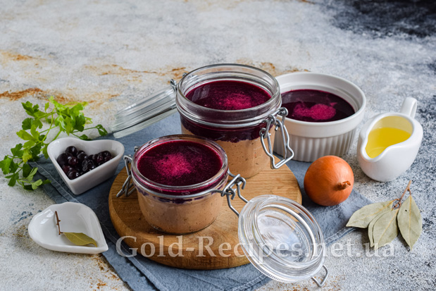 Перекладаємо готовий паштет із печінки в скляні ємності невеликого об’єму, заповнюючи їх на 2/3. Зверху заливаємо паштет смородиновим желе. Закриваємо посуд з паштетом кришкою, відправляємо закуску в холодильник на 1-2 години, щоб смородинове желе повністю застигло.