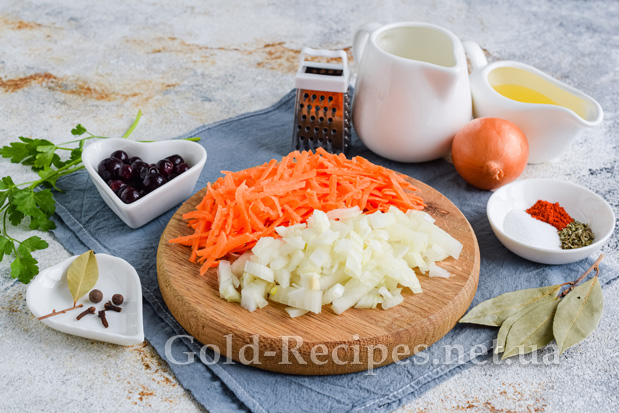 Цибулю очищаємо від лушпиння, нарізаємо дрібним кубиком. Моркву миємо, очищаємо від шкірки, подрібнюємо на тертці з великим полотном.