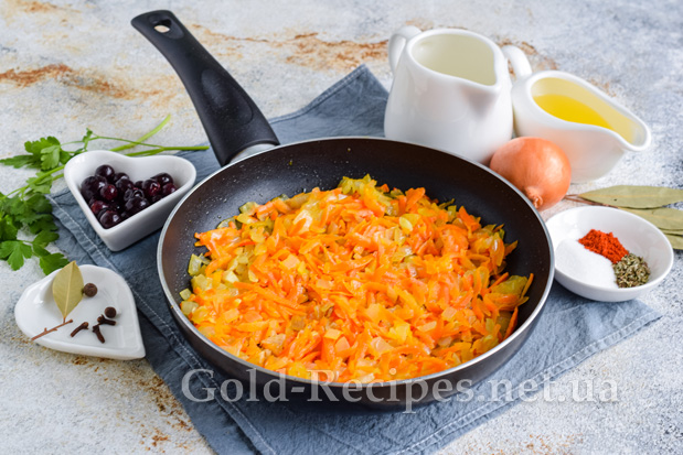 Викладаємо овочі на сковороду з розігрітою олією. Періодично помішуючи, пасеруємо цибулю з морквою на середньому вогні до м’якості. Остуджуємо овочі до кімнатної температури.