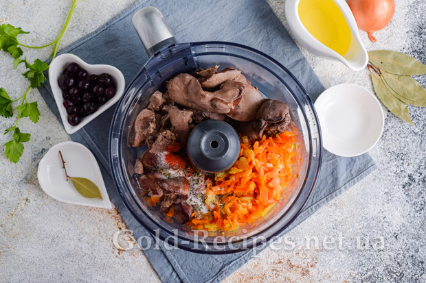 Перекладаємо в чашу блендера курячу печінку та пасеровані овочі. Додаємо сіль та спеції за смаком. Подрібнюємо інгредієнти до однорідної консистенції.