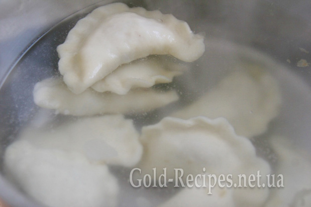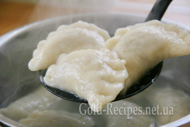 Після того, як вареники спливуть, варимо їх на невеликому вогні ще 5-8 хвилин. Готові вареники акуратно виймаємо шумівкою в миску або глибоку тарілку.